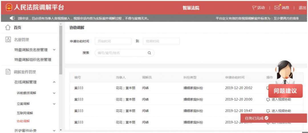 點擊彈窗中的協助按鈕,或者在協助調解模塊中找到需要協助調解的案件,在調解員開啟視頻調解的時候,點擊進入視頻協助按鈕進入視頻調解過程。
