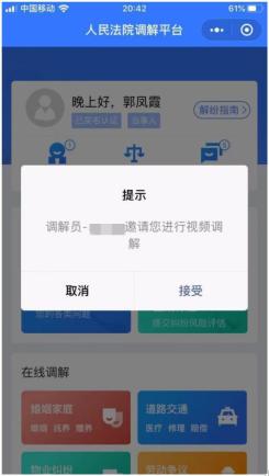 當調解員發起視頻調解,當事人可登陸微信小程序,在小程序主頁面會彈出視頻邀請提示。點擊接受后,即可與調解員開始視頻調解。
